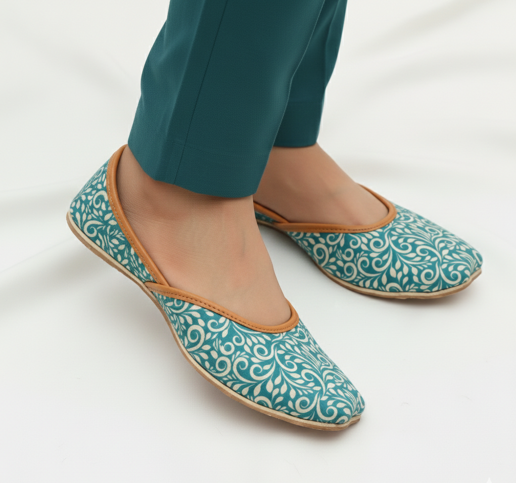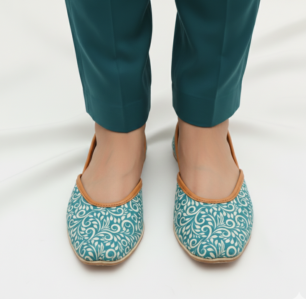 Step into a world of vibrant comfort with KhussaNova’s latest addition to the Casual Collection. Featuring a stunning teal base adorned with graceful white floral scrolls, these khussas are designed to bring a pop of color and a touch of tradition to your modern lifestyle.