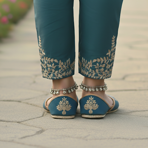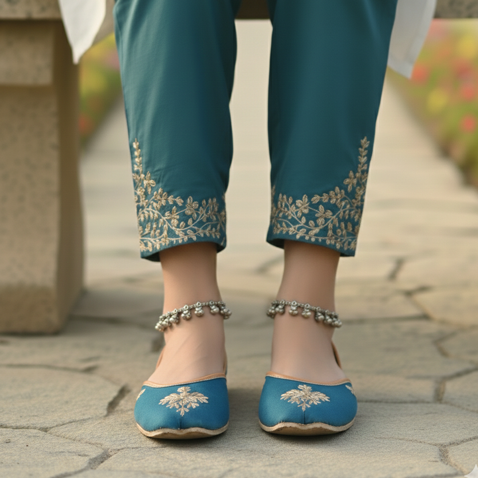 Step into elegance with our handcrafted Teal Blue Zardosi Khussas. Perfectly blending centuries-old craftsmanship with a modern aesthetic, these flats are designed for the woman who appreciates the finer details of traditional artistry.